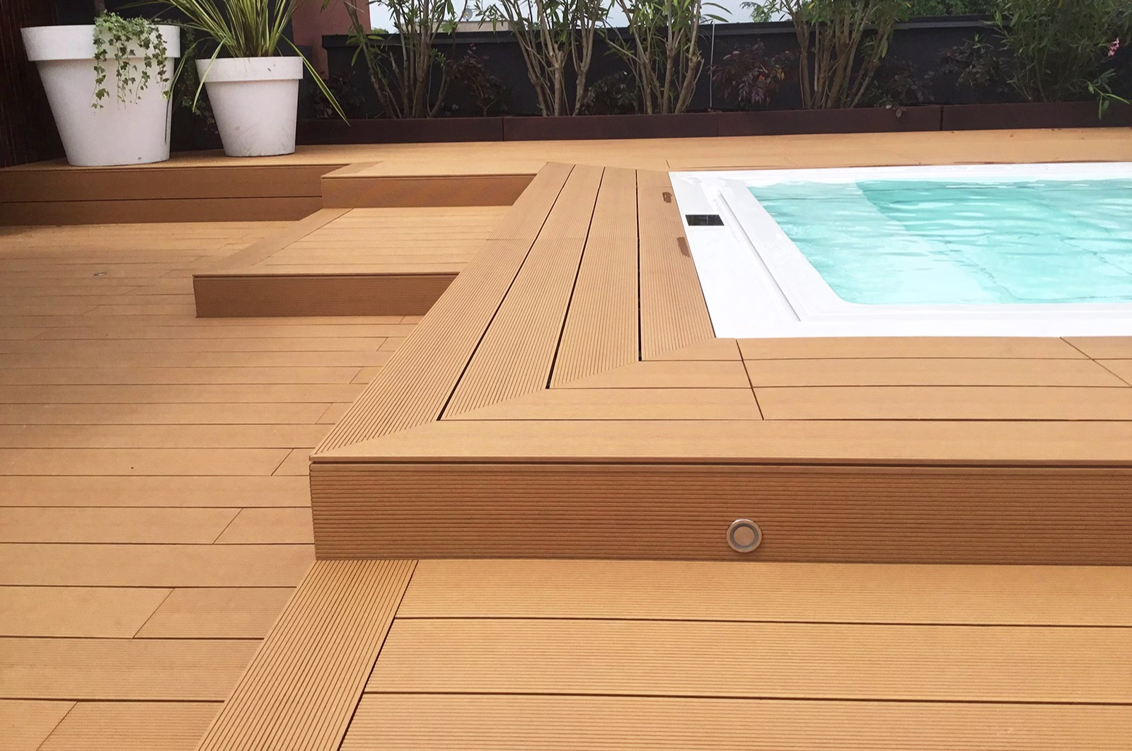 Great scope of colors, formats, and additional elements will pave the way to the bespoke ambient, transforming your terrace, balcony, pool, and yard into an exclusive private outdoor refuge. Versatile and beautiful, a deck made of composite materials can be seamlessly coordinated with an external kitchen, barbecue, fire pit, hot tubs, and other elements.