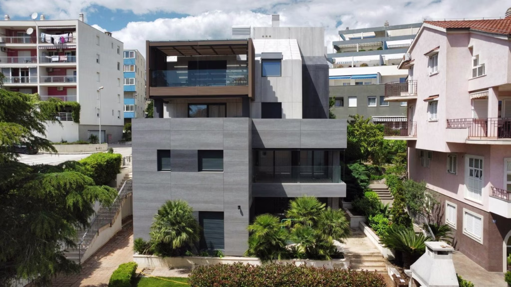 Projekt ventilirane fasade na privatnoj kući u Split realiziran je primjenom suvremenog sustava ventilirane obloge s velikoformatnim porculanskim pločama Laminam u formatu 1000 × 3000 mm, debljine 5+ mm. Odabrana kolekcija Pietra di Savoia u nijansama Perla, Grigio i Antracite unosi sofisticiranu interpretaciju prirodnog kamena te savršeno odgovara mediteranskom ambijentu i suvremenoj arhitekturi objekta.