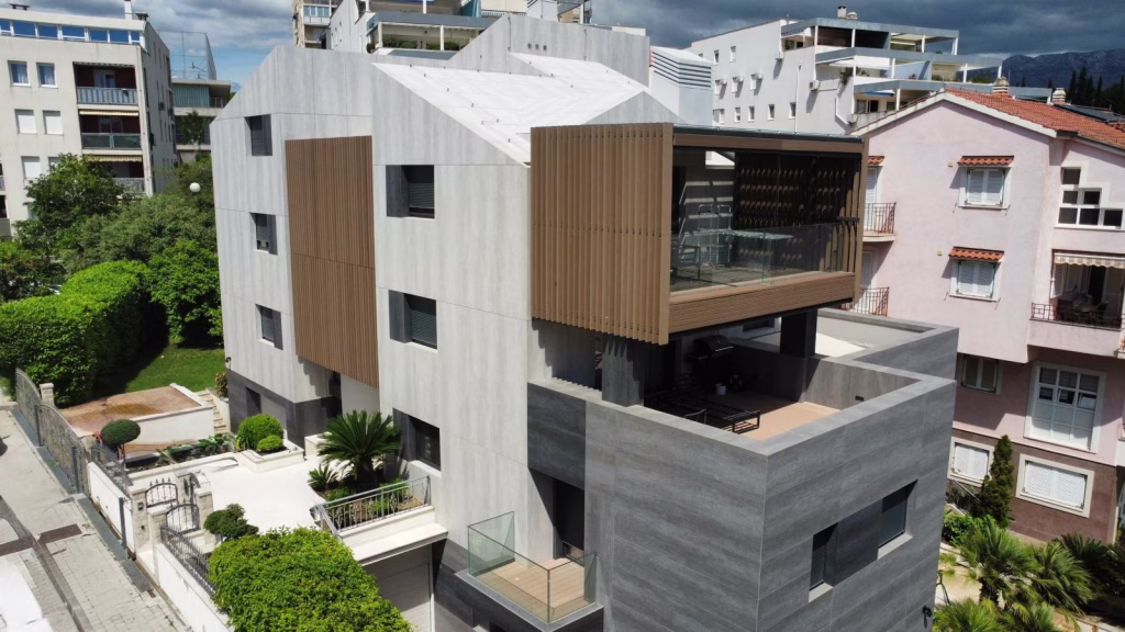 Ventilirana fasada osigurava visoku razinu energetske učinkovitosti, dugotrajnu zaštitu konstrukcije te otpornost na atmosferske utjecaje, dok velikoformatne ploče doprinose elegantnoj, monolitnoj estetici s minimalnim fugama. Posebnu vrijednost projektu daje izvedba krovišta u istom Laminam materijalu, čime je postignuta vizualna cjelovitost i arhitektonska čistoća forme. Kombinacija tehničke izvrsnosti, trajnosti i bezvremenskog dizajna čini ovaj projekt primjerom vrhunske primjene ventilirane Laminam fasade u privatnoj stambenoj gradnji.